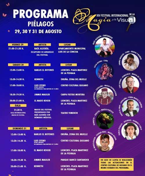 El domingo, 31 de agosto, de 12:00 a 13:00 horas, el Muelle de Oruña recibirá la visita de Karlus El Botones; de 13:30 a 14:30 horas, Luis Otero recalará en el Centro Cultural Quijano con un espectáculo recomendado para mayores de 12 años y aforo limitado y El Mago Roger, de 17:00 a 18:00 horas, en la Plaza Martínez de la Pedraja de Liencres.