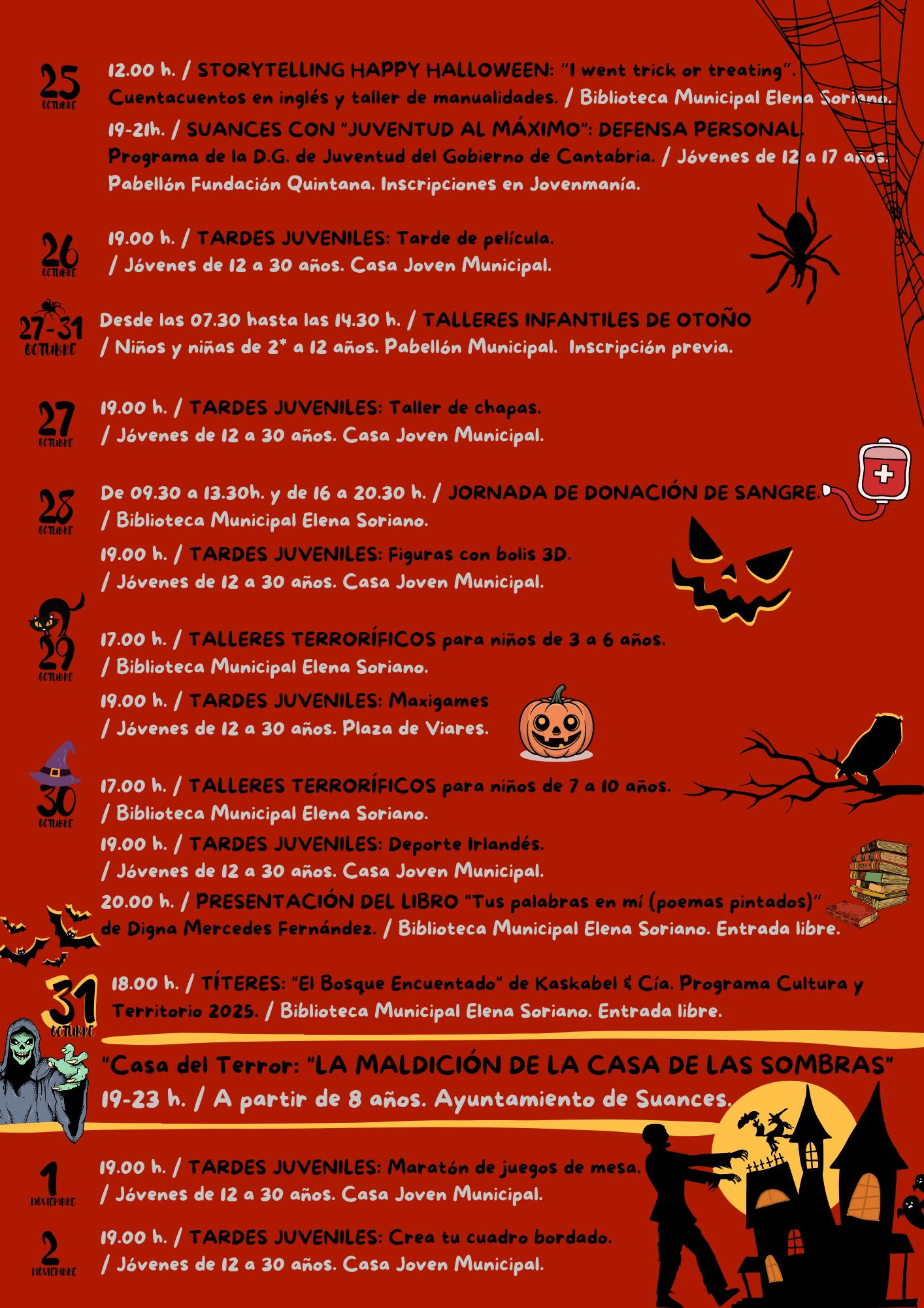 El programa dará comienzo el sábado 25 de octubre, a las 12.00 horas, con la sesión de storytelling más en la Biblioteca municipal. Se trata de una sesión de cuenta cuentos en inglés y un taller de manualidad entorno al cuento “I went trick or treating”. El mismo sábado por la tarde, de 19.00 a 21.00 horas, los jóvenes de 12 a 17 años participaran en el taller de defensa personal de Jovenmanía “Juventud al Máximo” que se celebrará en el pabellón Quintana (Inscripciones en Jovenmanía). El fin de semana finalizará con una sesión de cine dentro del programa “Tardes Juveniles”, de 12 a 30 años, de la Casa Joven (19.00 horas) y dicho programa se desarrollará durante toda la semana en la Casa Joven con las siguientes actividades: lunes 27 de octubre (19.00 horas), taller de chapas; martes 28 (19.00 horas), taller de figuras con bolis 3D; miércoles 29, maxigames (19.00 horas); jueves 30 (19.00 horas) sesión de deporte irlandés y sábado 1 y domingo 2 de noviembre, respectivamente, maratón de juegos de mesa y taller de crea tu cuadro bordado (ambos a las 19.00 horas).