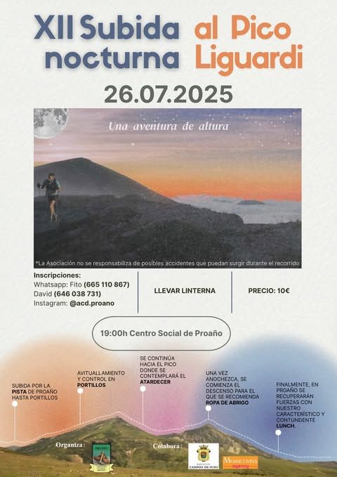 La Subida nocturna al Pico Liguardi , organizada por la Asociación Cultural de Proaño, comenzará a las 19:00 horas en el Centro Cultural de Proaño.